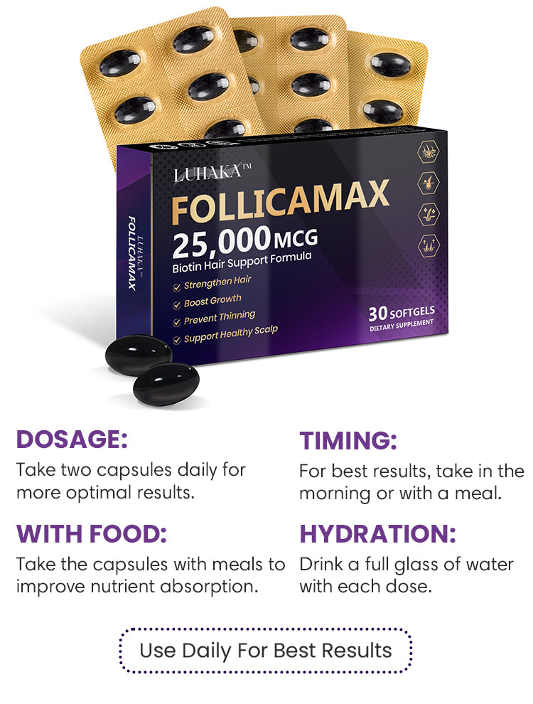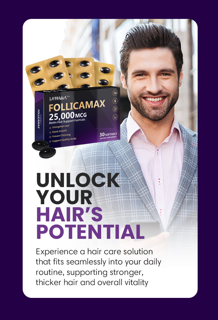 Luhaka™ FollicaMax is a dietary supplement designed to promote hair growth, strengthen hair strands, and improve scalp issues through a blend of natural ingredients and advanced nutritional science.